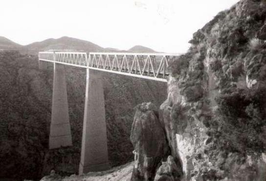 El cruce del Arroyo Salado implicó la realización de una de las obras de ingeniería más arriesgadas de las llevadas hasta entonces (siglo XIX) en España. Fue durante muchos años record de luz en España, gracias a sus tres tramos de 105 metros de luz, y de altura, sobre la parte más profunda del barranco con 110 metros de caída. Sería finalmente la Compañía de los Caminos de Hierro del Sur de España, la que asumiría con éxito tal operación, tomando las obras tras la suspensión de pagos efectuada por Fives-Lille. El tablero fue lanzado bajo la dirección de los ingenieros Basinsksi, Guerin y Shule, inaugurándose el servicio ferroviario el 14 de Marzo de 1899, siendo testigo de su inauguración el genial fotógrafo Arturo Cerdá y Rico. La pila del lado de Linares con 72'50 metros y la de Almería 74'55 metros, de obra de fábrica, tuvieron su ejecución en un año aproximadamente. El tablero original se cambió en 1976, por otro más moderno de acero, el cual ya no conserva el pasadizo bajo, y tiene una estructura metálica superior, conservándose actualmente las pilas y estribos originales de sillería, aunque recrecidos de hormigón.